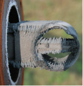 下面的圖片是一個典型的臟污影響測量的問題,這個高爐煤氣,用了一段時間以后,突然指示不對了,完全找不到渦街信號,我們通過我們在線檢測手段,判斷出探頭堵了,拆下后,手指摳干凈裝上,渦街立馬出來了,很穩定。