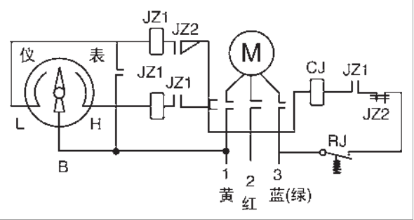 圖中 JZ1、JZ2- 繼電器及觸點 JR- 熱繼電器 ;M- 電機表中字母接線 L、B、H;B公共點 ( 黃 )、H 上限 ( 紅 )、L下限藍 (綠 )、表殼接地 (黑 )
